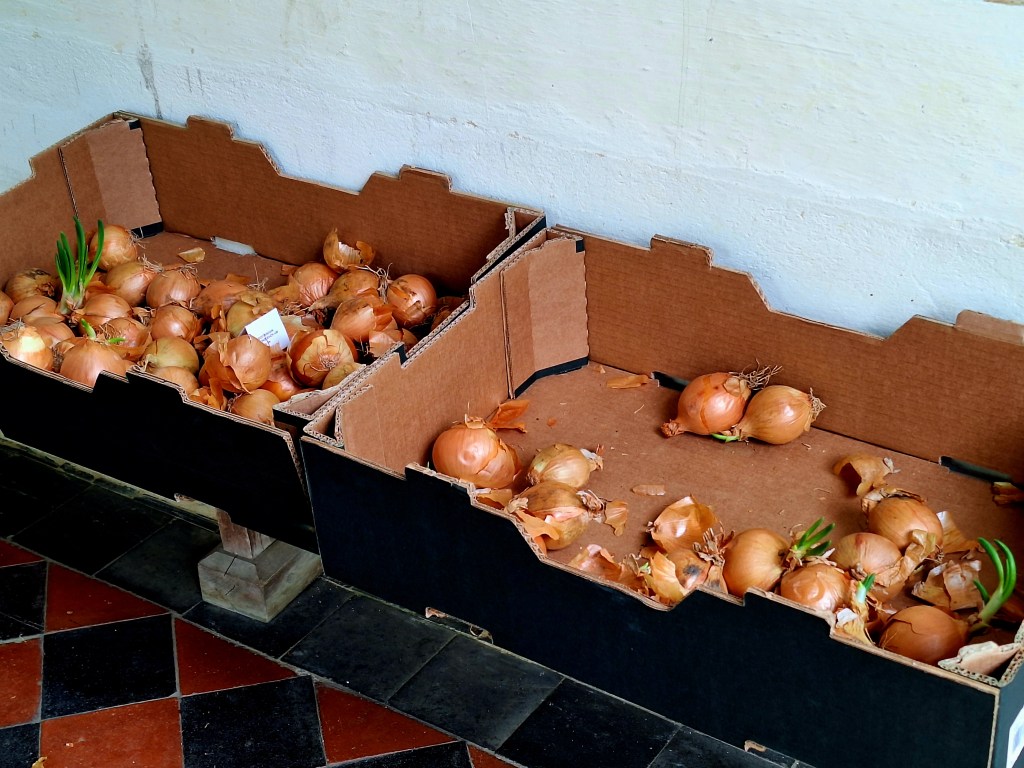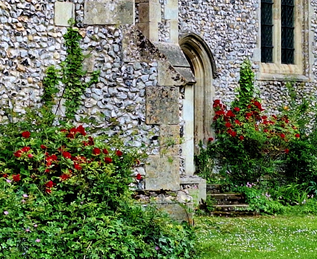 On the stroke of midday, I arrived at the church. There was no holy coffee or cake there either, but it had beautiful roses and a lot of onions! Jackdaws, shouted loudly in the eves
