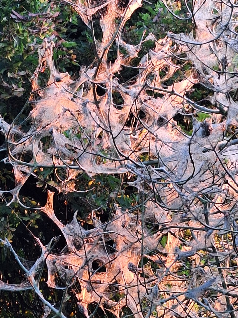 Leaving no trace, I decamped by 5am, as the sun came up. Along a short woodland trail, decorated with Ermin Moth silk. Then across a road and onto a metalled track. It was nice to be out of the dust.