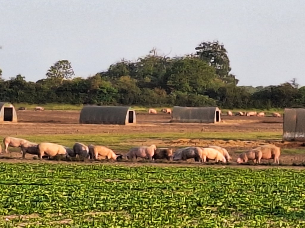 It’s so odd that the pig farms are in open fields. Out in the baking sun, with tin huts for shelter. Is this how bacon is made? I wondered why they were not grazed in the woodland?