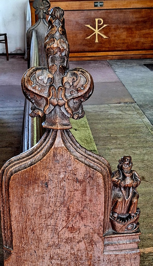 All Saints, a beautiful grade 1 listed church with a magical door, caught my eye. I entered to find a wall muriel and 15th-century carved bench ends