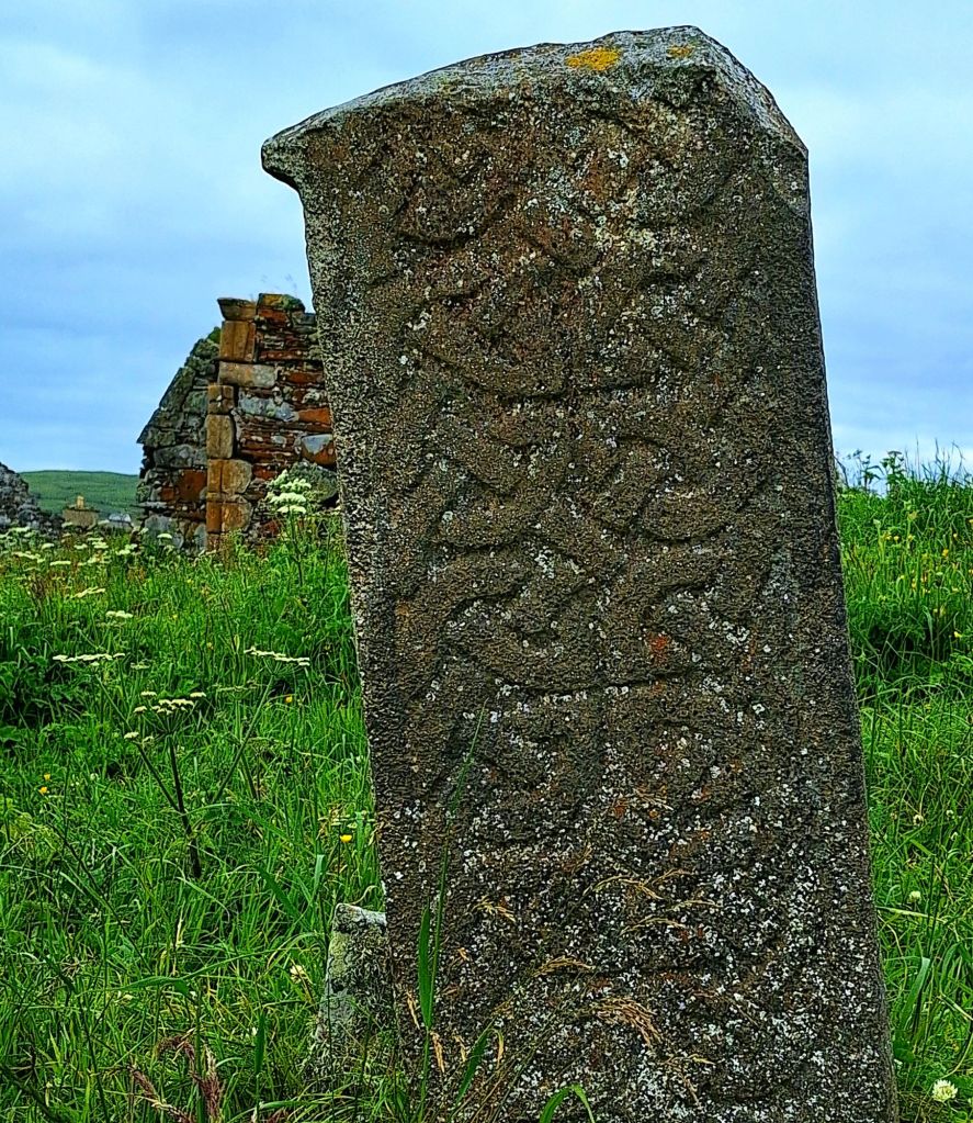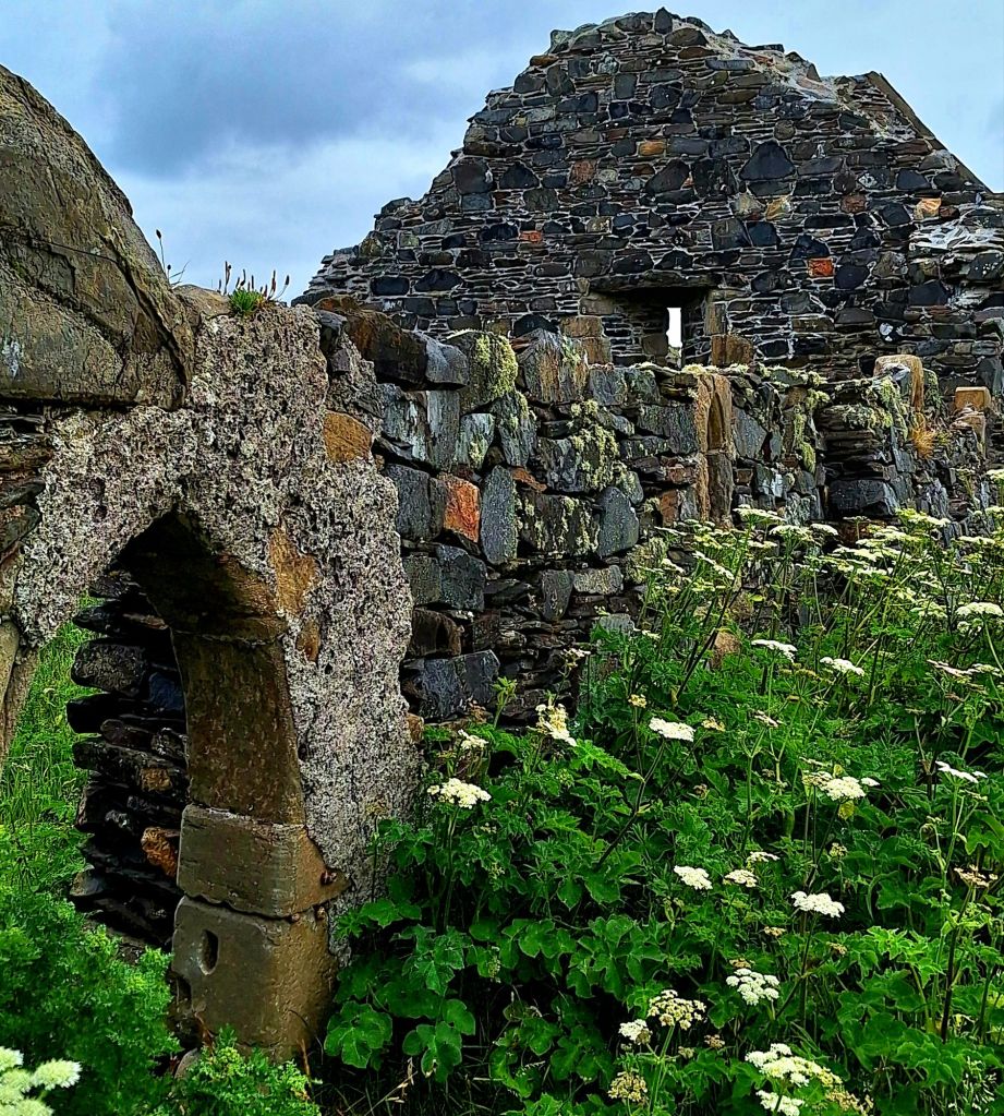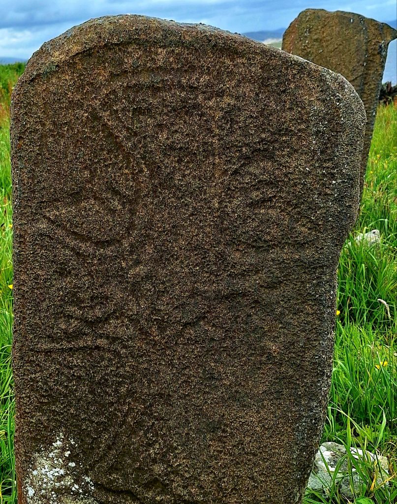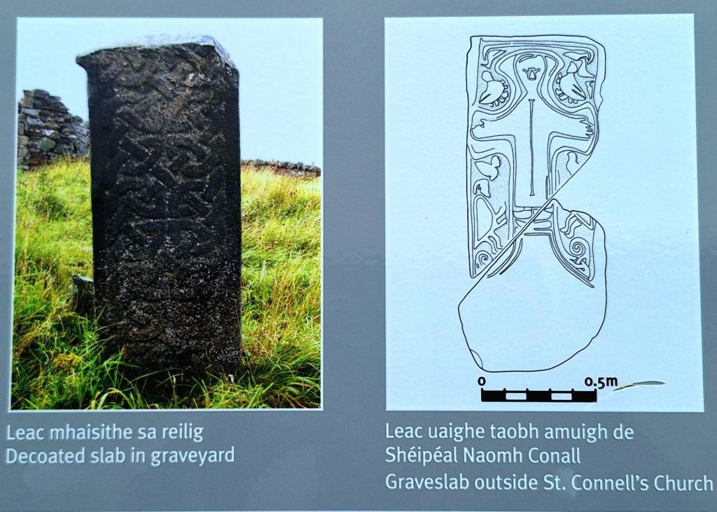 The island itself is home to the ruins of a 6th-century monastic settlement, founded by St. Conall Cael. As I explored the remnants of the ancient churches, I also spent time with the early medieval grave slabs. These weathered stones, some dating back to the 8th or 9th century and adorned with intricate carved patterns, marked graves from centuries past.