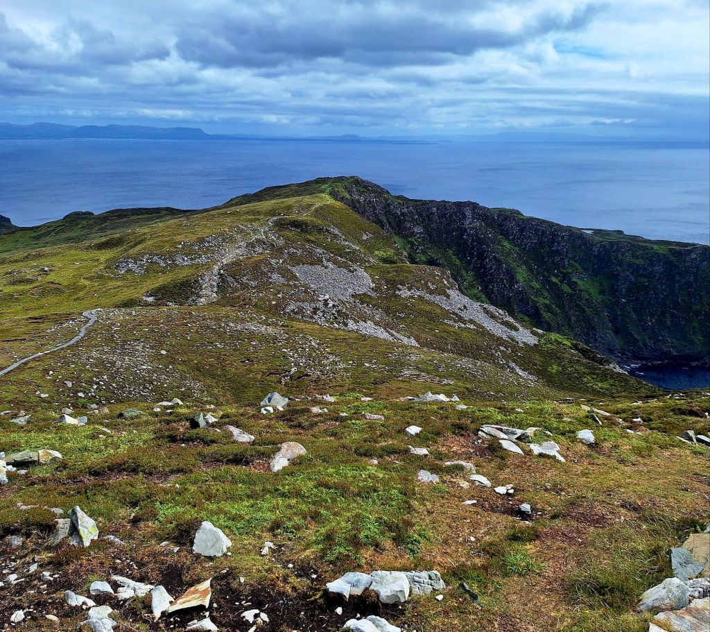 The first part of the trail follows a well-worn track along the cliffs to the summit of Cnoc Ramhar, where the path becomes eroded and boggy. There are spectacular views of the cliffs from here.