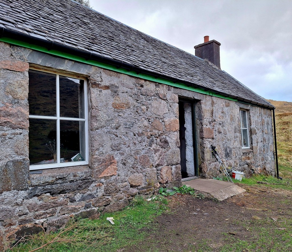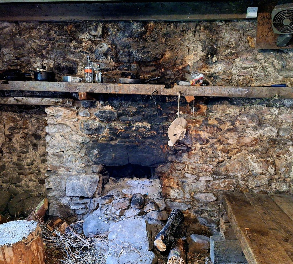 Corryhully bothy provided a welcome stop, miso, oat cakes, water and electricity, before heading up and over the bealach.