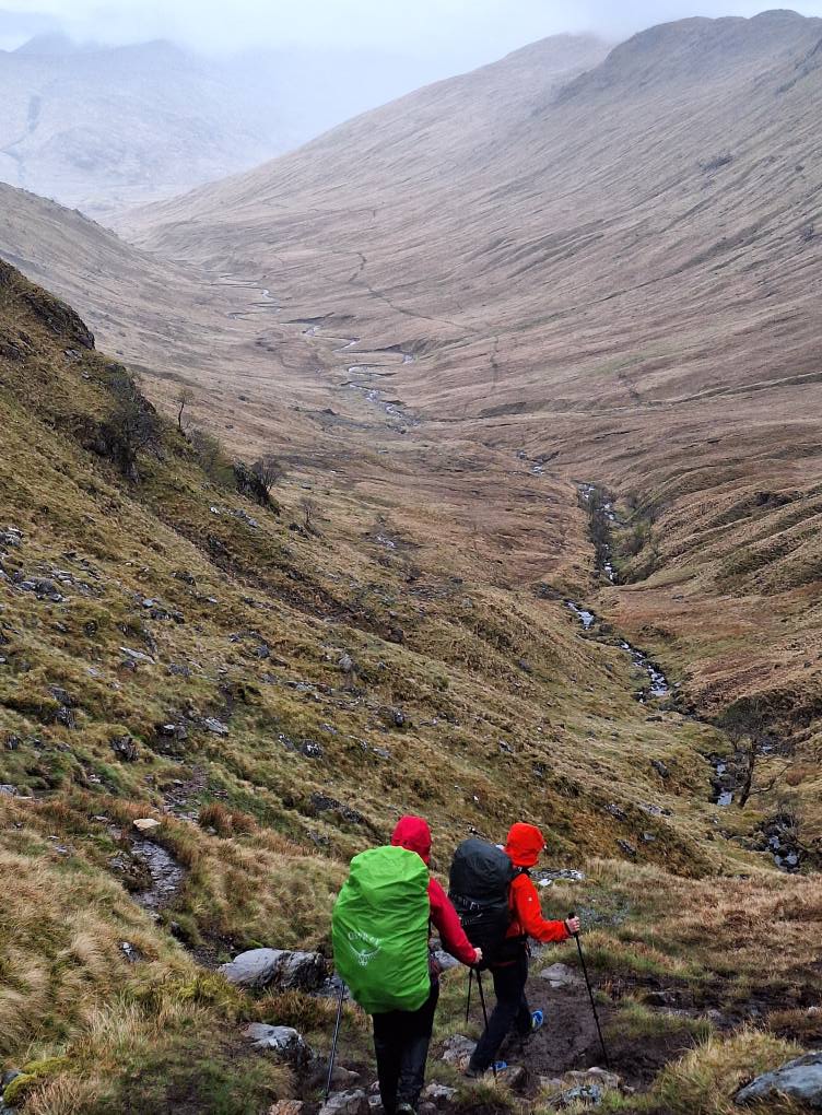 Descending Gleann Cuirnean, the path got rougher with scrambles where the river had eroded it. We stayed left and crossed before a steep ravine to the larger River Pean.