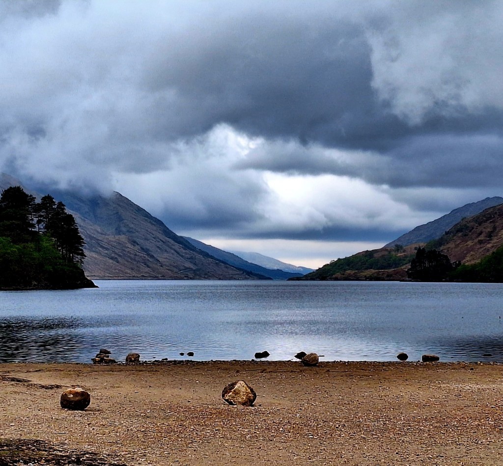 Glenfinnan itself is famous for the Glenfinnan Monument, commemorating the Jacobite rising of 1745. We paused to admire the views across Loch Shiel, the sky brooding in the background.