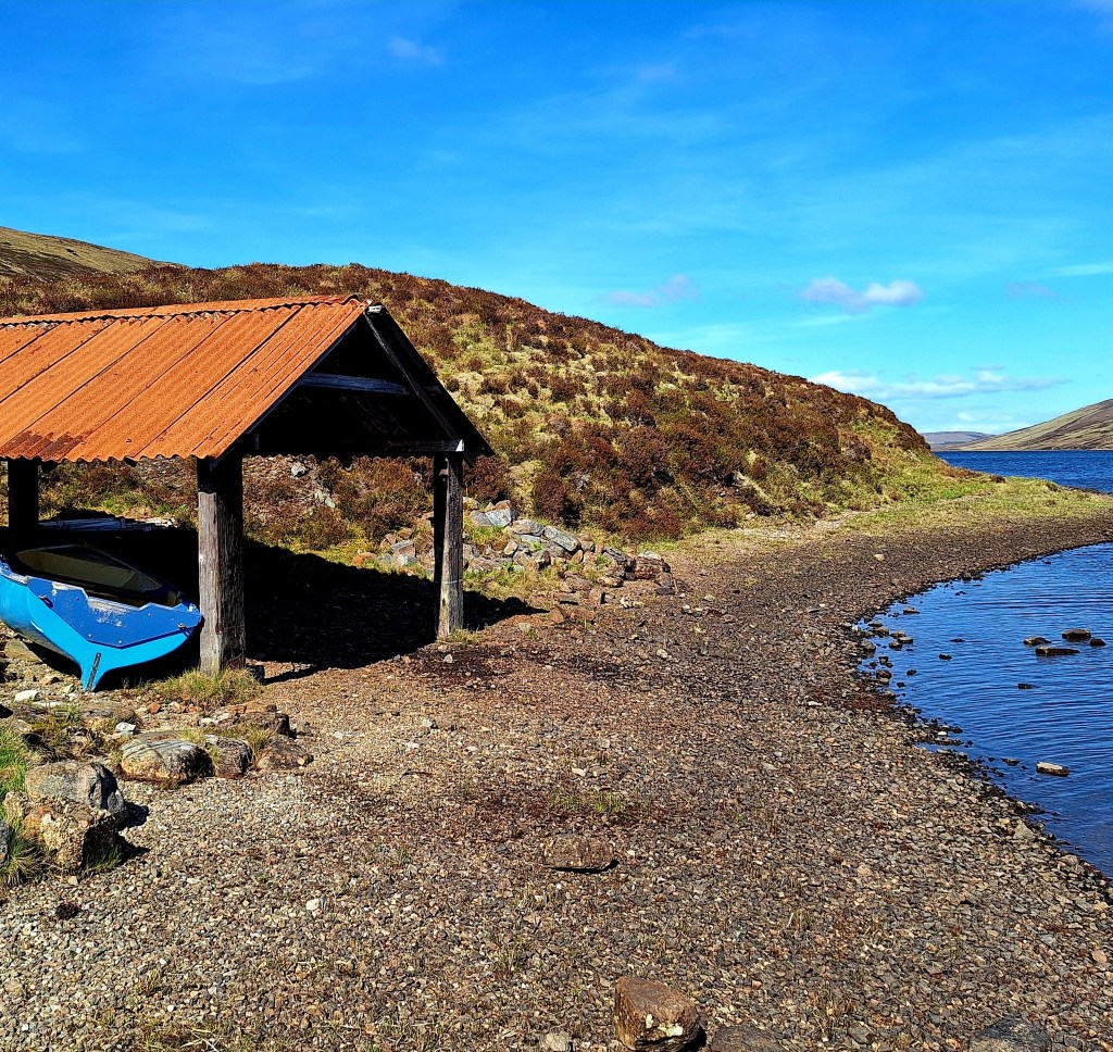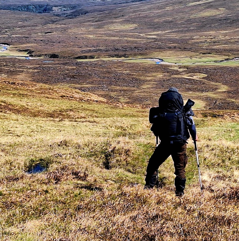 More steep climbing on a 4 x 4 track for 3 – 4 km, then onto open trackless moor. This section is known for its potential difficulty and navigational challenges, often requiring careful route-finding across open terrain. We had anticipated a very hard day. But, it was easy navigation (in good weather). From the end of the track, look ahead and you will see a tall man-made cairn in the distance, walk towards it.