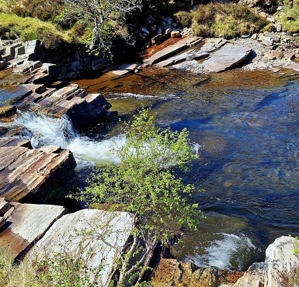A small turbine house and a weir across the River Lael, are part of a ‘run of river’ hydro-electric scheme. This system harnesses the river’s natural flow to generate power, enough for a town the size of Ullapool, with minimal environmental impact