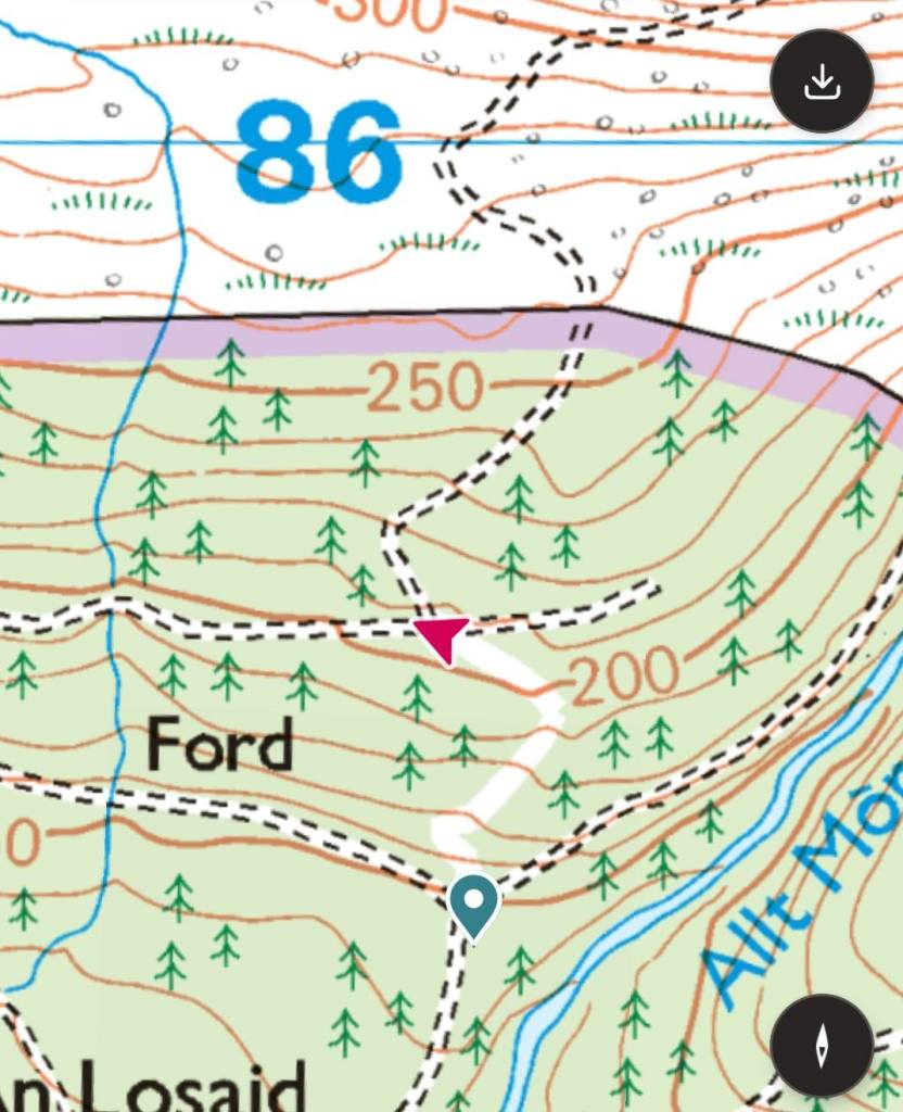 From the top of the moor you can see Glendouchery River. Look for the sheep pen on the left of the river and walk towards it. In the dry conditions it was an easy hike, but this area can be notoriously boggy. This is what our guide said “As you clear the forest, the path becomes steadily boggier and less distinct before disappearing completely. The key here is not to drop too far down towards Allt na Lairige – it’s a boggy horrible mess that will destroy your spirits early in the day”.